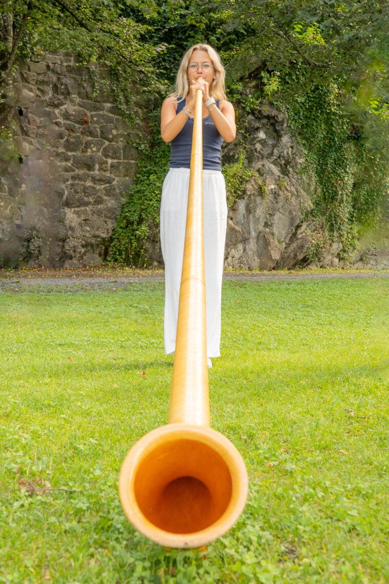 Dann wird das 3,47 Meter lange Alphorn an das Mundstück gesteckt. Es ist zwischen zwei bis drei Kilo schwer, und wir sind daher dankbar für den Fuss, der es am Boden stabilisiert. «Gerade stehen. Die Arme locker. Mit dem Zwerchfell stützen», weist uns Nelly an. Fast alle von uns bringen auf Anhieb einen Ton raus – oder ungewollt auch mehrere, denn es ist tückisch den Ton zu halten. Ein Alphorn kann 16 Töne erzeugen, 12 davon werden in den meisten Stücken eingesetzt. «Anfangston ist immer das C», sagt Nelly. Doch wie finde ich das C?