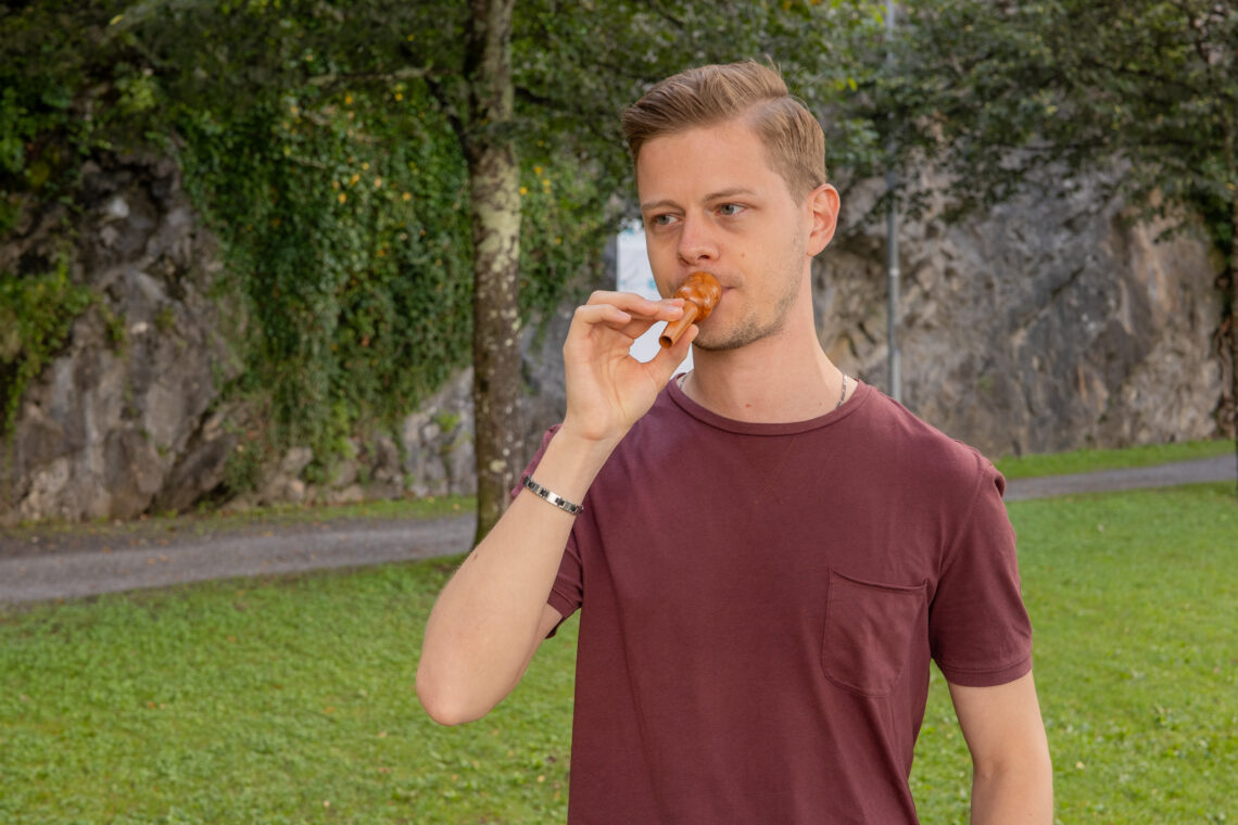 Das Geheimnis, aber auch die Schwierigkeit liegt bei der Luft und den Lippen. Viel Luft und entspanntere Lippen erzeugen tiefe Töne. Je mehr man die Lippen presst, desto höher wird der Ton. So viel zur Theorie. Zeit für eine Kurzumfrage beim Team.