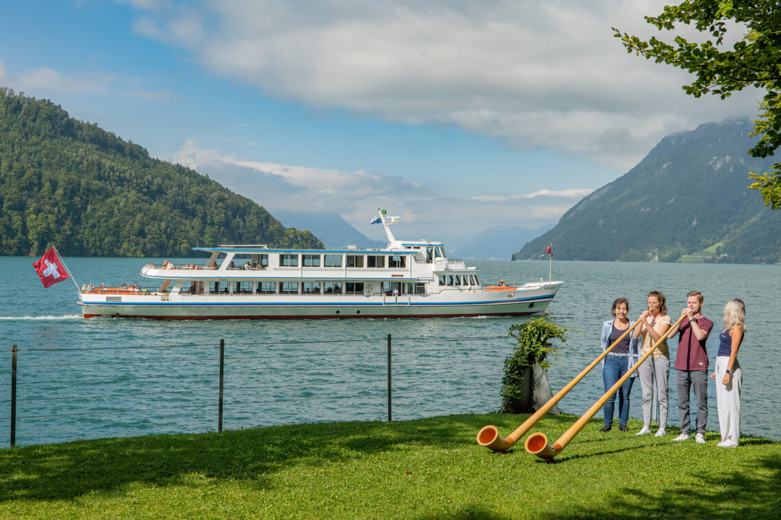 Im Schnupperkurs zeigt sich schnell: Wer bereits ein Blechblasinstrument spielt, ist im Vorteil. Wir drei Nicht-Musikantinnen freuen uns über unsere Töne. Unser Hobbymusiker kann am Schluss sogar ein Lied zusammen mit Nelly spielen. Gefallen hat es uns allen, und wir können dir diese spannende Erfahrung empfehlen. Wenn man zum See hinaus spielt und ein Schiff vor der Bergkulisse vorbeifährt, dann ist das wie gelebte Heimat. Alphornklänge hört man an klaren Tagen über eine Distanz bis 10 Kilometer. Ob sie uns auf dem Schiff gehört haben?