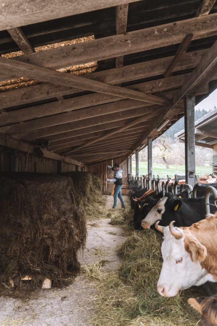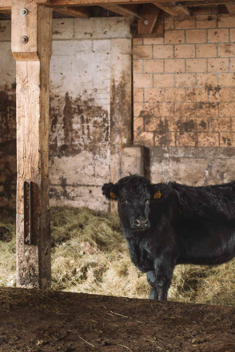 Ganz hinten im Stroh liegt ein kleines Häufchen Schwarz. Es ist ein verwuscheltes Kälbchen, mit dem wachsamen Blick von Mamma Kuh auf sich gerichtet, während diese uns mit einem skeptischen Side Eye in Schach hält. «Das Kalb ist gestern auf die Welt gekommen», liest Gerry Stalder meine Gedanken. Gerry ist Betriebsleiter des Stalder Biohofs – oder wie seine Frau Karin sagen würde: «Der Chef von diesem Budeli».
