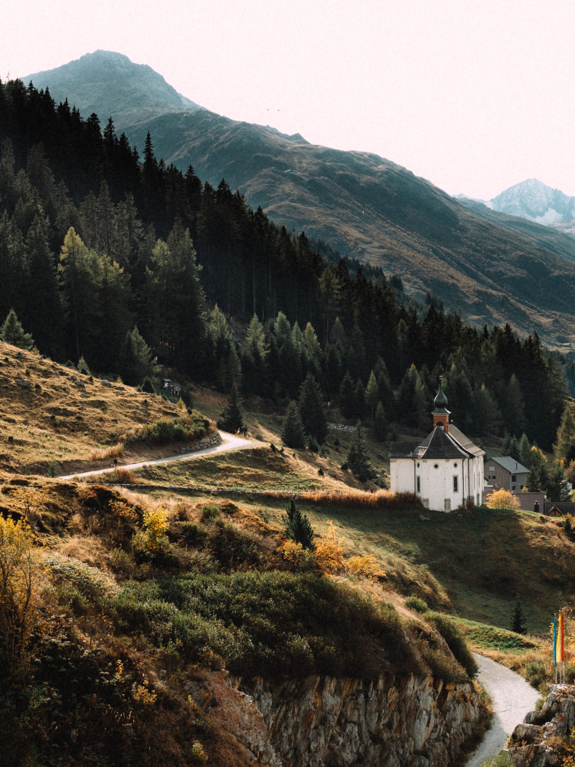 Der Weg vom Gurschenwald ins Dorf führt durch die herbstliche Berglandschaft.