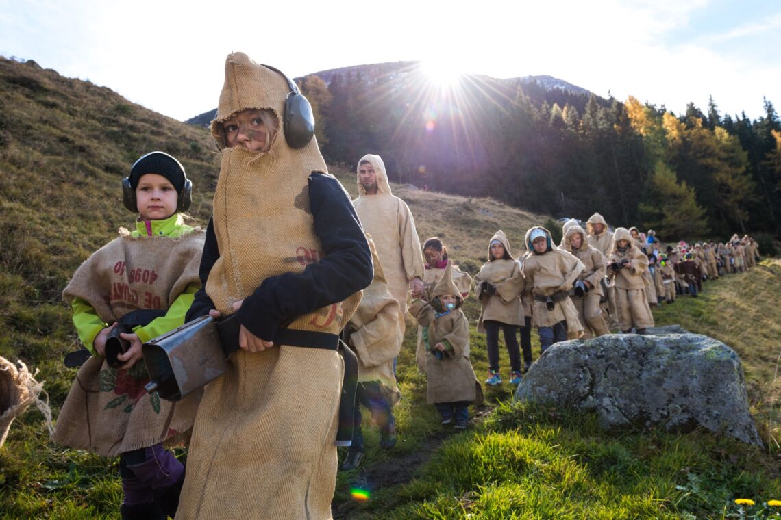 Die Natur zeigt sich in goldener Farbenpracht, die Luft ist frisch und die tiefstehende Sonne taucht die Bergwelt in ein stimmungsvolles Licht. Bei Jacqueline und ihrer Familie beginnen wenige Tage vor dem Umzug die Vorbereitungen: Die kratzigen Gwändli aus Jute werden aus der alten Truhe geholt. Passen die Gwändli noch? Muss noch ein neues genäht werden oder muss etwas repariert werden? Glück gehabt, alle Gwändli passen noch. Nur das selbstgemachte «Bockähourä» ist leider nicht mehr da. Das hat sich wohl letztes Jahr einen neuen Besitzer gesucht.