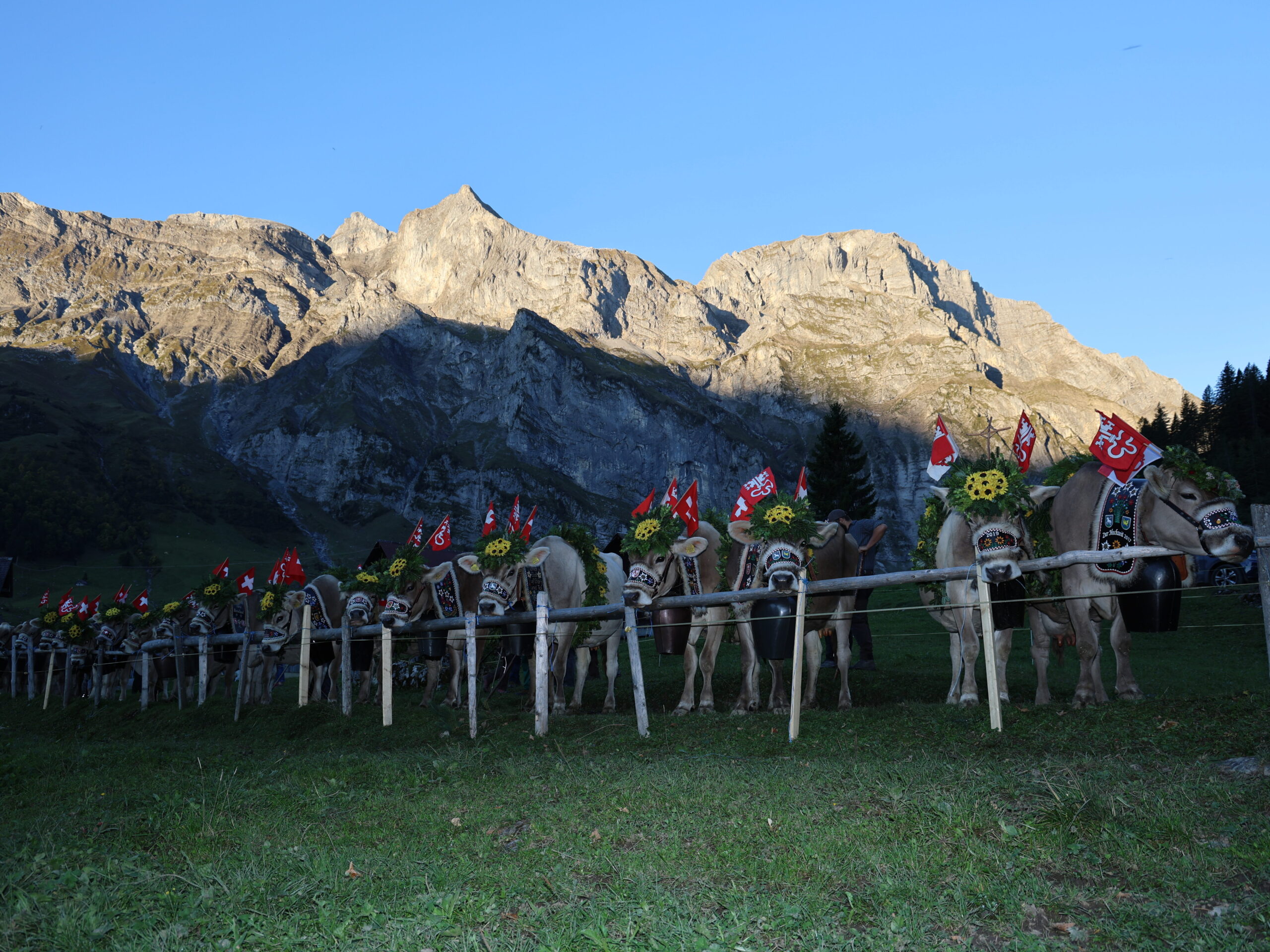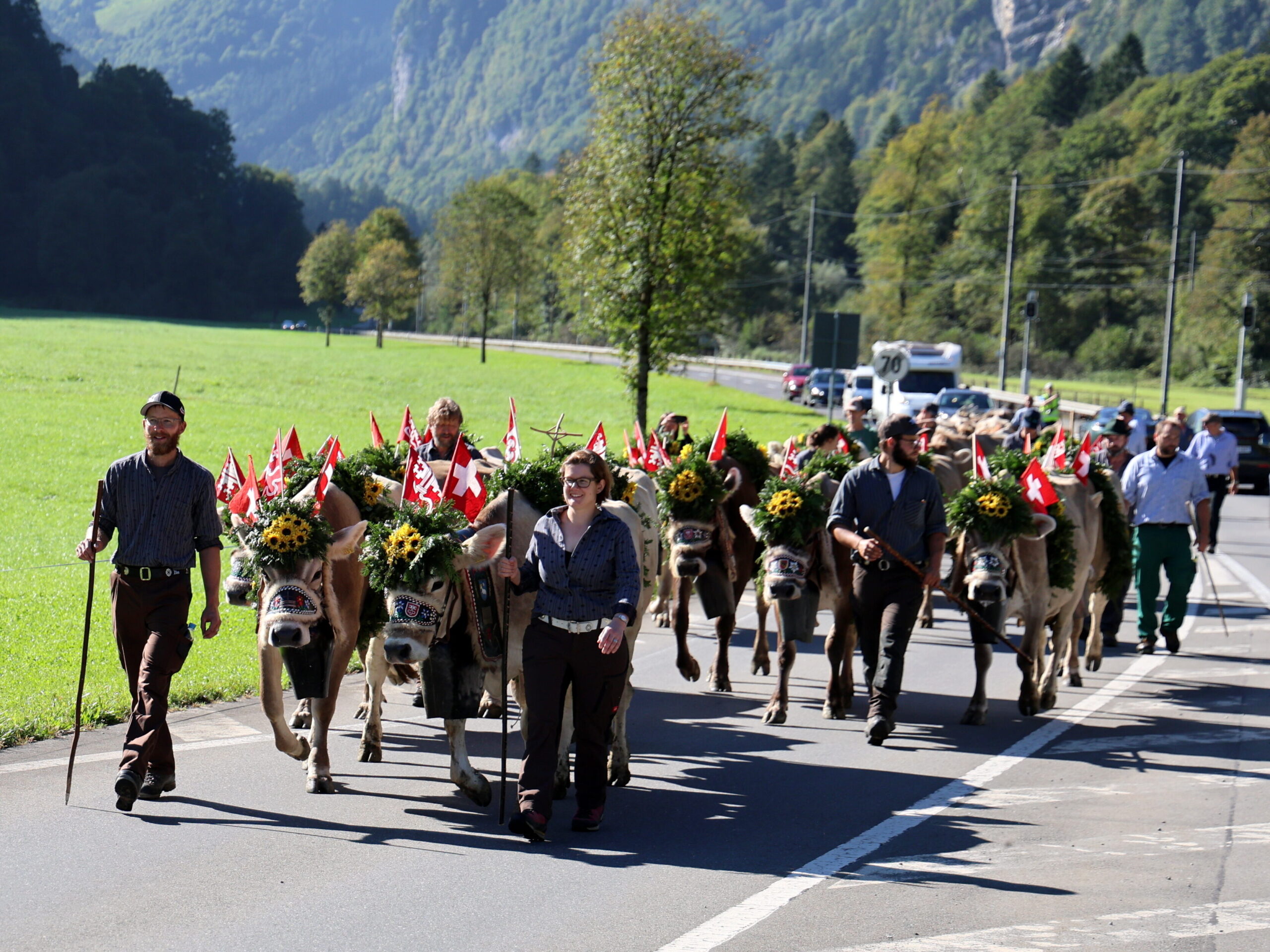 Jetzt geht’s los: einen Moment, der uns jedes Jahr erneut tief ins Herz geht und Hühnerhaut bringt. Die Leitkuh vorab, das «Säntä» hinterher. Schritt um Schritt verlassen wir die Alpweiden, ziehen vorbei an den Nachbars-Alpen, bis wir bald im Dorf Engelberg sind. Diese Ruhe auf dem ersten Streckenabschnitt ist unbeschreiblich.