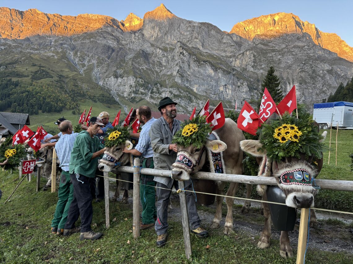 Gut gestärkt geht es nach dem Frühstück los. Das Herzklopfen wird bei allen, besonders bei der Älplerfamilie, immer intensiver. Das Vieh wird in Reih und Glied vor dem Stall platziert, geschmückt und bereit gemacht. Sobald das Vieh bereit ist, stürzen sich auch die Helfer noch in saubere Kleider und nun klopft das Herz bei allen bis zum Hals. Wir stimmen einen «Natuirjuiz» an und geniessen so die letzten Minuten vom Alpsommer.
