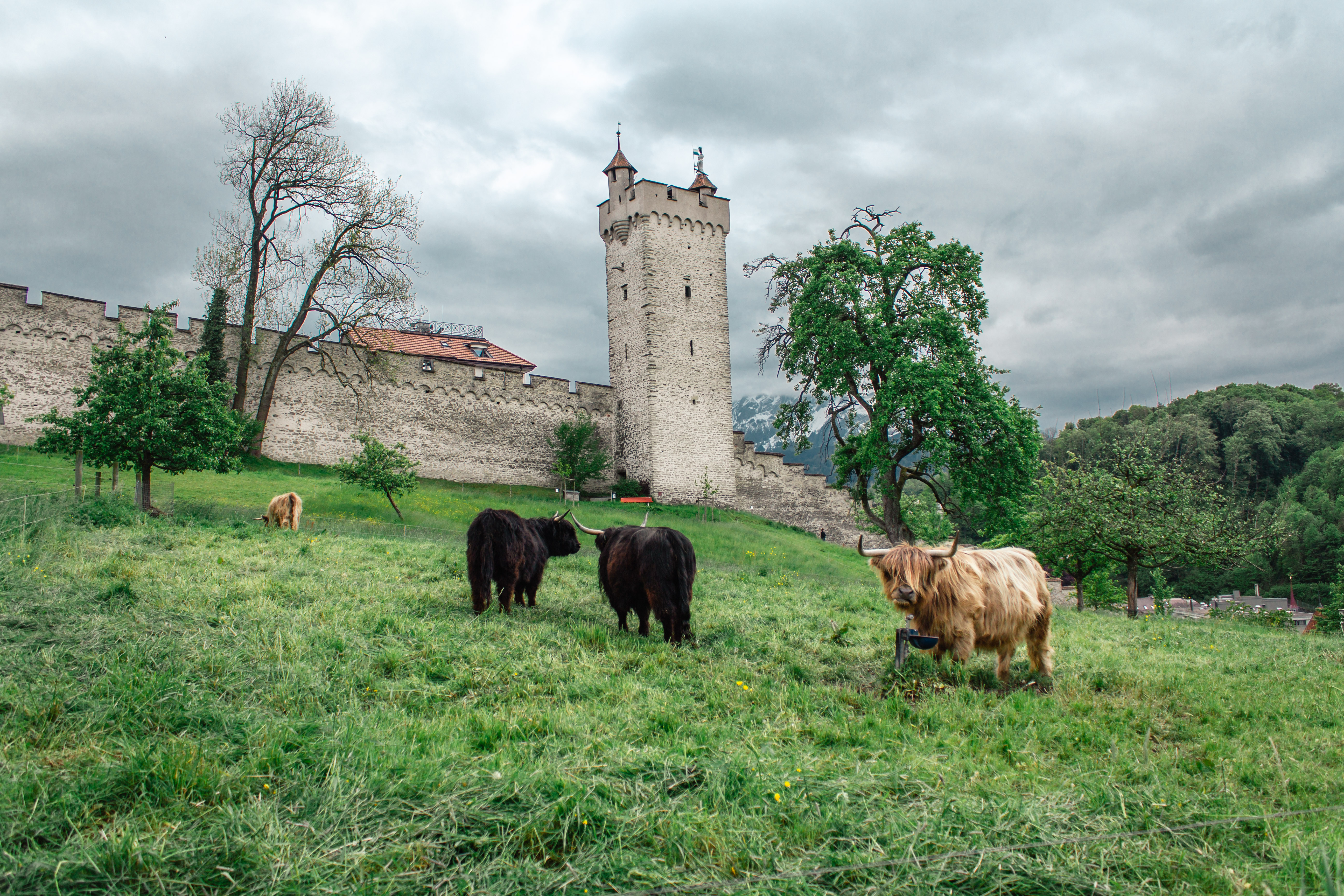 In der Zwischenzeit haben die vier Hochlandrinder komplett das Interesse an mir verloren und kauen in der Mitte der Wiese desinteressiert auf einem Grasbüschel herum. Ich beschliesse noch kurz den Männliturm und den Zytturm zu besichtigen und mir das schöne Luzern von oben anzuschauen. Schreiende Wädli beim Aufstieg, zittrige Knie beim Abstieg. «Jetzt bloss nicht runterstolpern, es dauert eine Weile bis dich hier jemand findet«, denke ich mir und klammere mich noch mehr ans Geländer. Stimmt so nicht ganz, schliesslich gehört die Museggmauer zu den Hauptattraktionen von Luzern. Nichtsdestotrotz habe ich die Museggmauer bei meinem letzten Besuch als touristenarm empfunden (zugegeben: es war bereits 18:30 Uhr und es wehte ein eisiger Wind der jeden Nordpol-Wind blass aussehen liess).