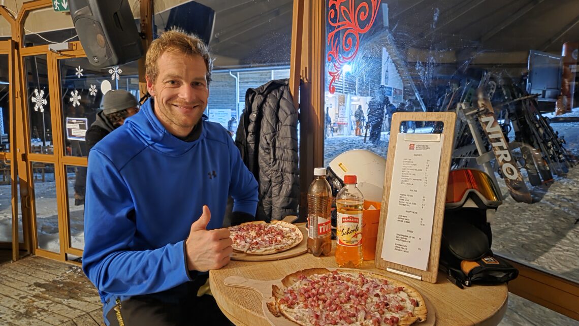 Nach ein paar Abfahrten legen wir eine Pause in der Rossweid Schneebar ein. Auch diese füllt sich nach und nach und der DJ sorgt für gute Stimmung. Da sich bei uns langsam ein kleines «Hüngerli» bemerkbar macht, probieren wir gleich das neue Angebot mit dem frischen Flammkuchen. Perfekt um wieder gestärkt auf die Pisten zu gehen.