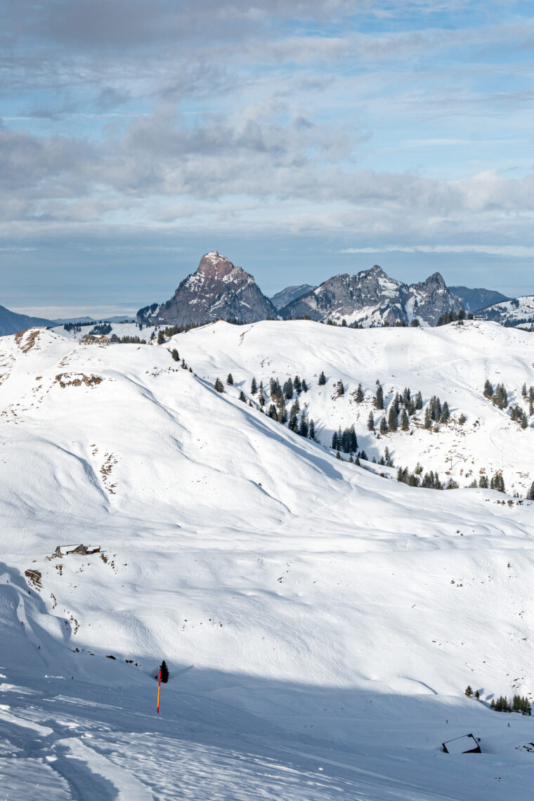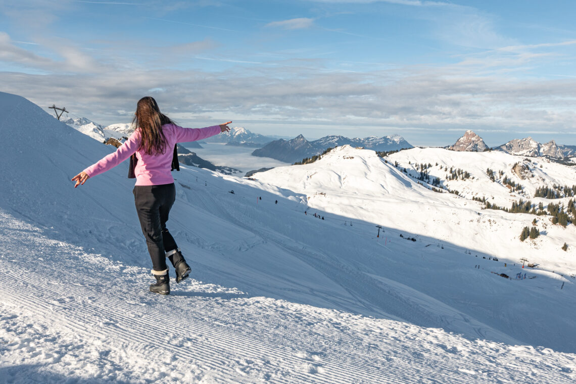Oben im Seebli angekommen, zieht es uns gleich höher. Wir steigen auf die Sesselbahn Sternen um und fahren auf 1811 Meter. Diese Aussicht. Der Vierwaldstättersee versteckt sich im Nebel, die markanten Mythen grüssen, das Skigebiet Hoch-Ybrig breitet sich vor uns aus, dahinter liegen der Sihlsee und das Mittelland. Dieses Panorama begleitet uns auf dem Winterspaziergang von der Bergstation Sternen zur Bergstation Hesisbol. Zwischendrin liegt uns das Muotatal zu Füssen. Der Weg ist einfach und mehrheitlich flach. Da die Sesselbahn Hesisbol keine Fussgängerinnen transportiert, gibt es das Panorama auf dem Rückweg aus einem anderen Blickwinkel.