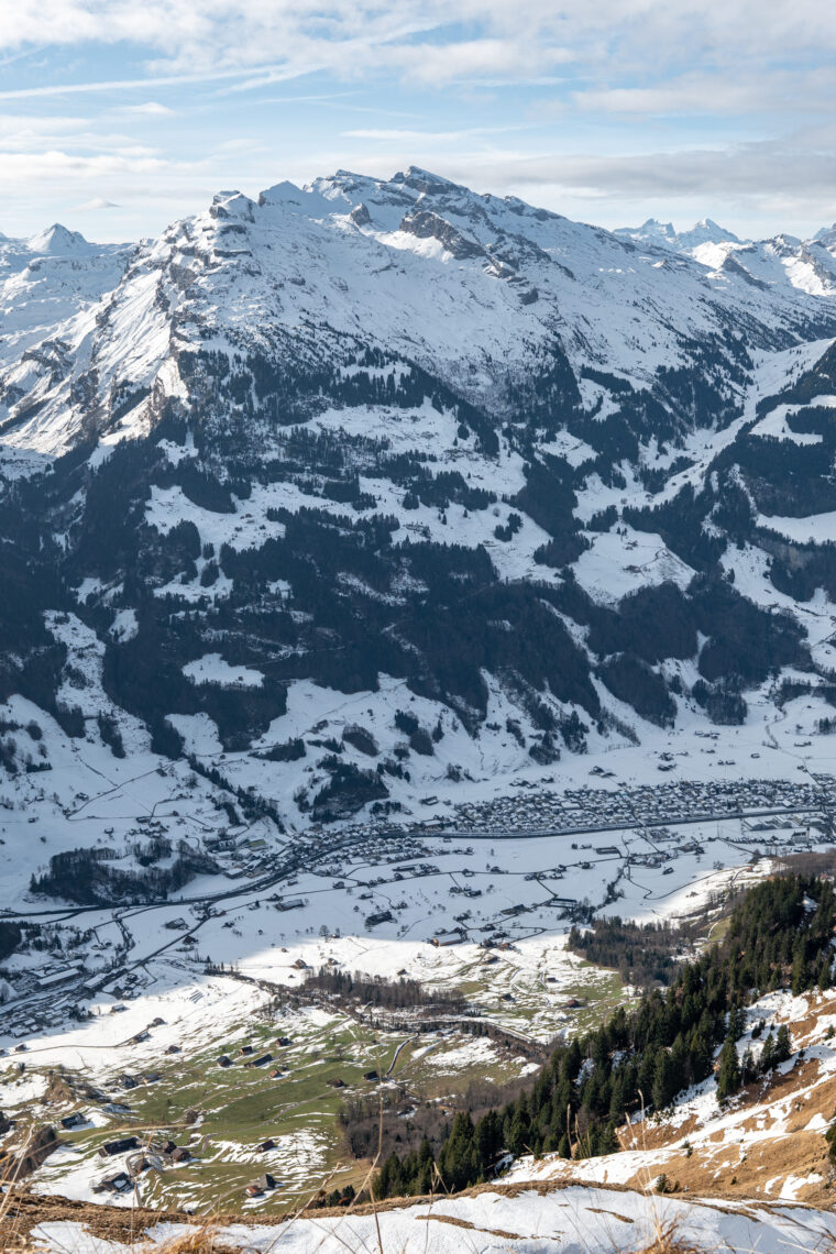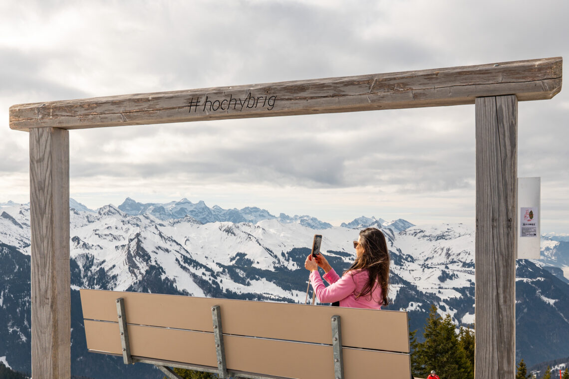Den Kaffee wollen wir uns verdienen. Also zurück zum Seeblisee, wo heute niemand eisfischt. Wir umrunden den See und fahren danach mit der Sesselbahn auf den Spirstock. Hier fotografieren wir ausgiebig die 360-Grad-Aussicht, auch von der drehbaren Bank aus. So fühlt sich Freiheit und Sorglosigkeit an. Um diesen Moment zu verlängern, trinken wir auf der Terrasse des Restaurants Spirstock einen Kaffee und gönnen uns nicht nur den Panoramablick, sondern auch einen Mandelgipfel.