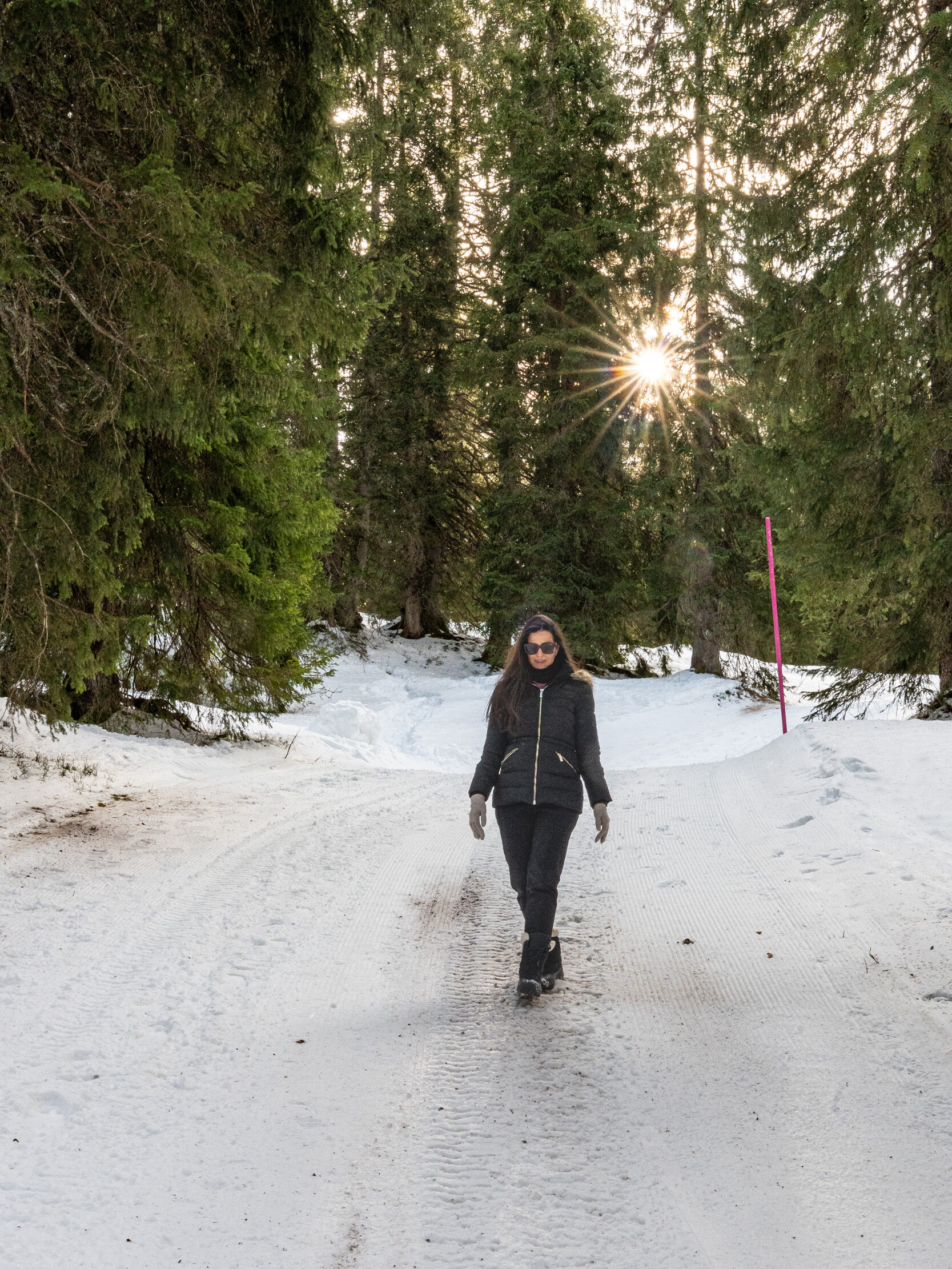 Mit erwachendem Appetit fahren wir mit der Sesselbahn Sternen wieder runter und wandern Richtung Mittagessen ins Restaurant Stäfel. Der Weg führt vorbei an zwei Förderbändern, wo Kleine und Grössere der Schweizer Ski- und Snowboardschule Hoch-Ybrig ihre ersten Schwünge üben. Im Wald beginnen die Höhenmeter und uns wird langsam warm. Auf dem letzten Stück entlang der Skipiste beobachten wir dynamische Abfahrten.