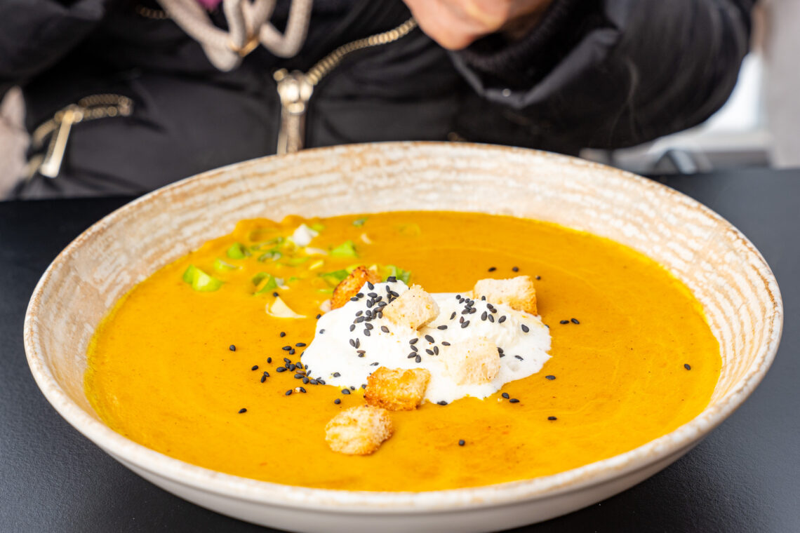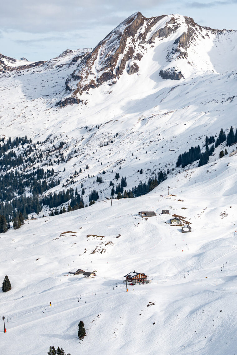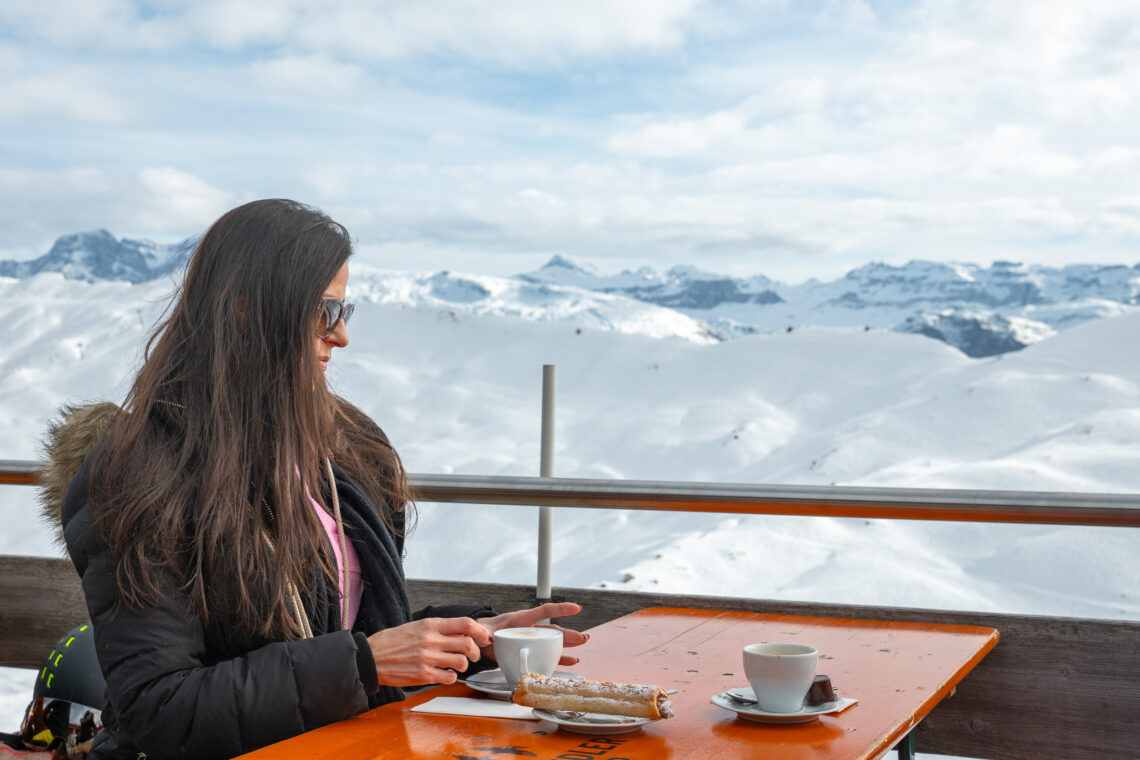 Der Stäfel ist ein klassisches Pistenrestaurant mit grosser Terrasse. Die Mittagskarte ist klein, hält aber trotzdem eine gute Auswahl bereit – auch an vegetarischen Optionen. Begeistert sind wir von den Isoliermatten auf den Stühlen. So bleibt es gemütlich, selbst als die Sonne kurz hinter den Wolken verschwindet. Und dann dieses Gefühl, mitten in den Bergen zu sitzen und in Ruhe eingehüllt zu sein.